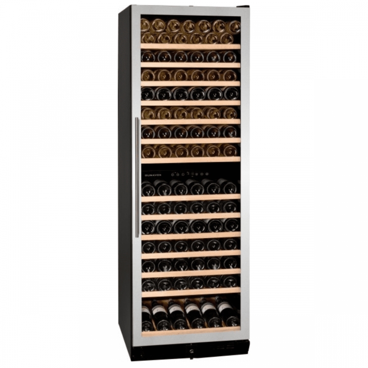 Tato velkokapacitní kompresorová vinotéka pojme až 166 lahví 0,75 l. bordeaux. Má elegantní černou barvu a díky přením průduchům ji můžeme zabudovat nebo nechat volně stát. Bude určitě ozdobou Vaší domácnosti a pýchou každé restaurace. Jistě uvítáte, že vinotéka má dvě zóny k správnému uložení,jak červeného,tak bílého vína. Teplotu můžeme nastavit na každou zónu dle potřeby za pomoci přehledného digitálního displeje. Ten je umístěn uvnitř spotřebiče a odděluje tak opticky vrchní a spodní zónu. Funkce dotápění Vám pomůže rychle dosáhnout požadované teploty. Police jsou z kvalitního dřeva, což napomáhá udržovat správnou vlhkost a uhlíkový filtr zabraňuje nechtěnému zápachu. Ve dvířkách je UV filtr a benefit je možnost zamykání. Určitě uvítáte možnost záměny směru otvírání dvířek. Tato vinotéka je jistě správná volba.