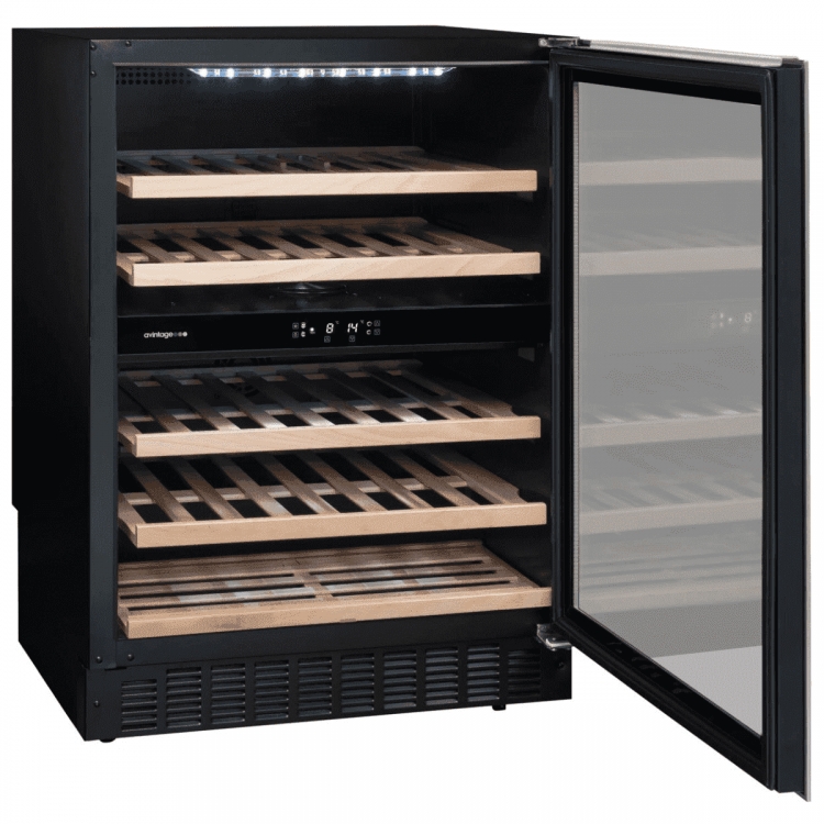 Dvouzónová vinotéka značky Avintage s možností instalace jako volně stojící nebo vestavěná pod pracovní deskou, možnost demontáže spodní ventilační mřížky a jejího nahrazení nábytkovým soklem; celková kapacita 50 lahví, rozsah nastavení teplot: 5-10 °C pro horní zónu a 10-20 °C pro spodní zónu; prosklené dveře s ocelovým rámem a decentním madlem na horní hraně dveří; 2 vrstvy tvrzeného hnědě tónovaného skla s UV filtrem; černé tělo vinotéky; bílé LED osvětlení s vypínačem; 4 výškově stavitelné nožky; 4 ks polovýsuvných dřevěných polic; 1 ks poloviční polovýsuvné dřevěné police; elektronická regulace teploty; displej v bílé barvě; automatické odmrazování; regulace vlhkosti; systém aktivní ventilace v obou zónách; antivibrační systém; energetická třída G; klimatická třída N; roční spotřeba energie 145 kWh; použitelná při okolní teplotě 16-32 °C; hlučnost 39 dB; hmotnost 50 kg; rozměry (Š x H x V) 59,5 x 57,1 x 82 cm