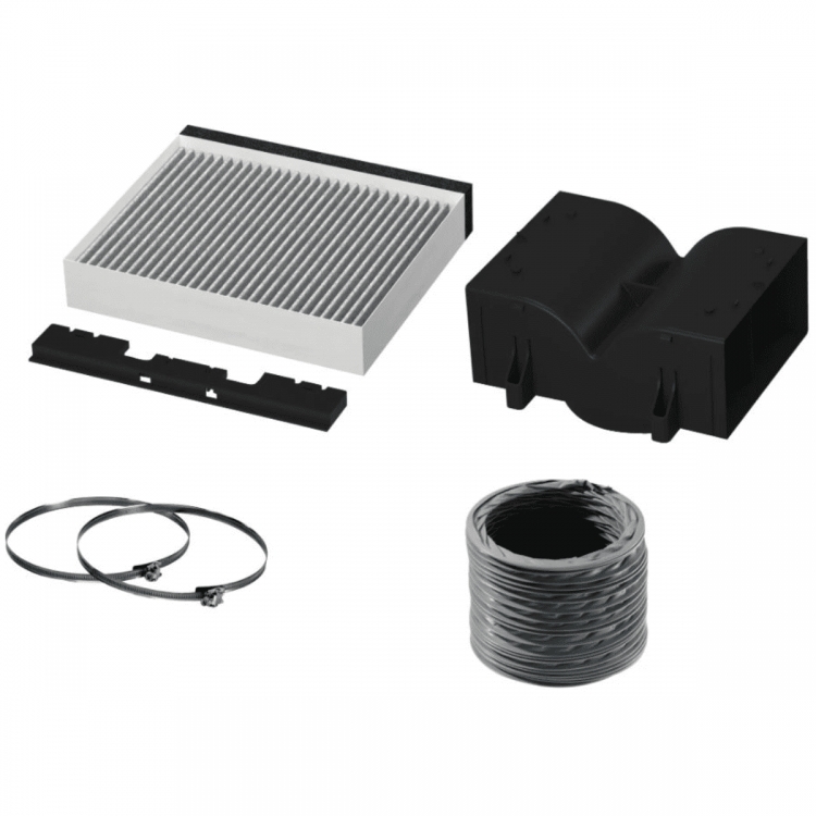 obsahuje: pachový filtr s aktivním uhlím CleanAir Standard, deflektor, flexibilní hadici o o 150 mm a délce 800 mm, 2 hadicové svorky a montážní materiál