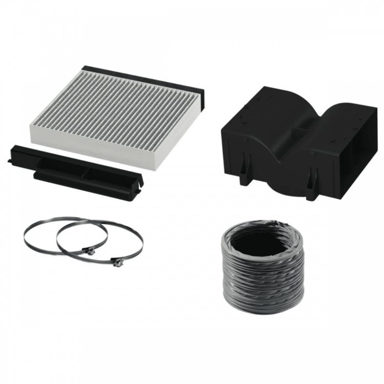 obsahuje: pachový filtr s aktivním uhlím CleanAir Standard, deflektor, flexibilní hadici o o 150 mm a délce 800 mm, 2 hadicové svorky a montážní materiál