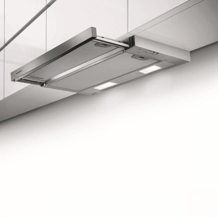 Odsavač disponuje aktivní výsuvnou částí, která po vysunutí sepne digestoř v přednastaveném režimu. Zasunutím lišty se funkce automaticky deaktivují.