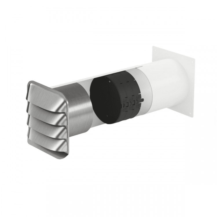 Teleskopická stěnová příruba s Thermoboxem a venkovní nerezovou žaluzií. Aerodynamicky tvarované směrové lamely žaluzie E-Jal Col zabezpečují optimální odvod vzduchu.