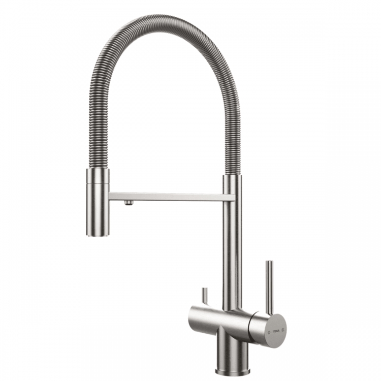 Kuchyňská baterie s vysokým ramínkem, dvojitou pákou, flexibilní koncovkou a kompatibilní se systémem filtrované vody