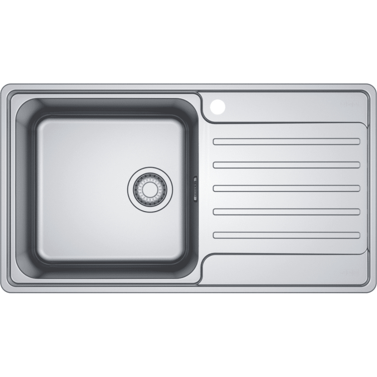 Nerezový dřez Bell. Cena zahrnuje: Sítkový ventil 3 1/2“ s přepadem. Sifon pro úsporu místa 6/4“ s odbočkou na myčku nádobí. Otvor pro baterii Ř 35 mm. Fixační příchytky Fast-Fix.